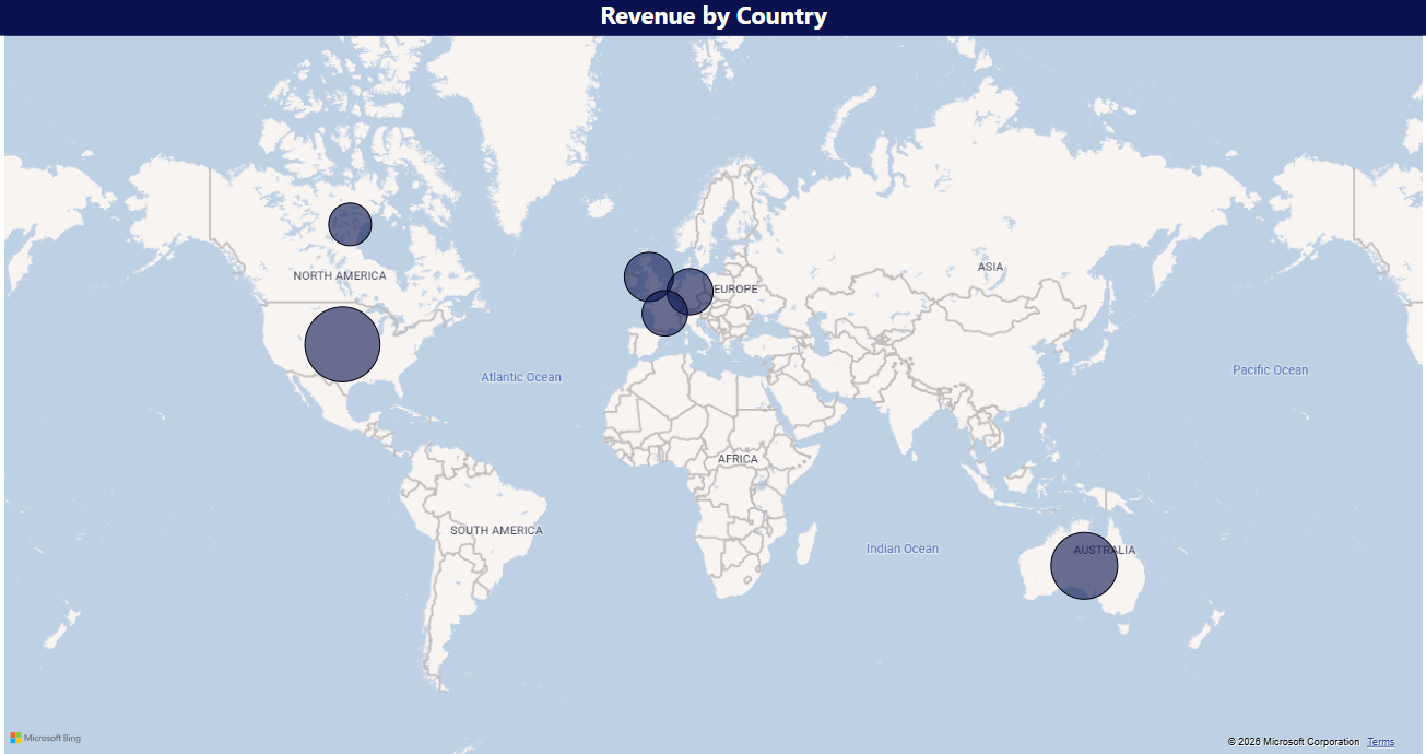 for revenue, profit, and margins, and built geographic and trend-based Power BI visuals.